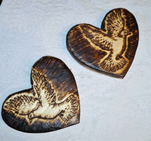 Um etwas Besonderes zu schaffen, als letztes Geschenk für sie und eine Stütze für ihre Tochter, habe ich aus Kiefernholz zwei Herzen gesägt und mit Brandmalerei jeweils identisch eine Taube darauf gebrannt. Beide Tauben sind spiegelverkehrt zueinander, als Symbol für die Anderswelt und als Spiegel der verbliebenen Seele. Eins für sie-es wurde ihr mitgegeben und eins für ihre Tochter…
